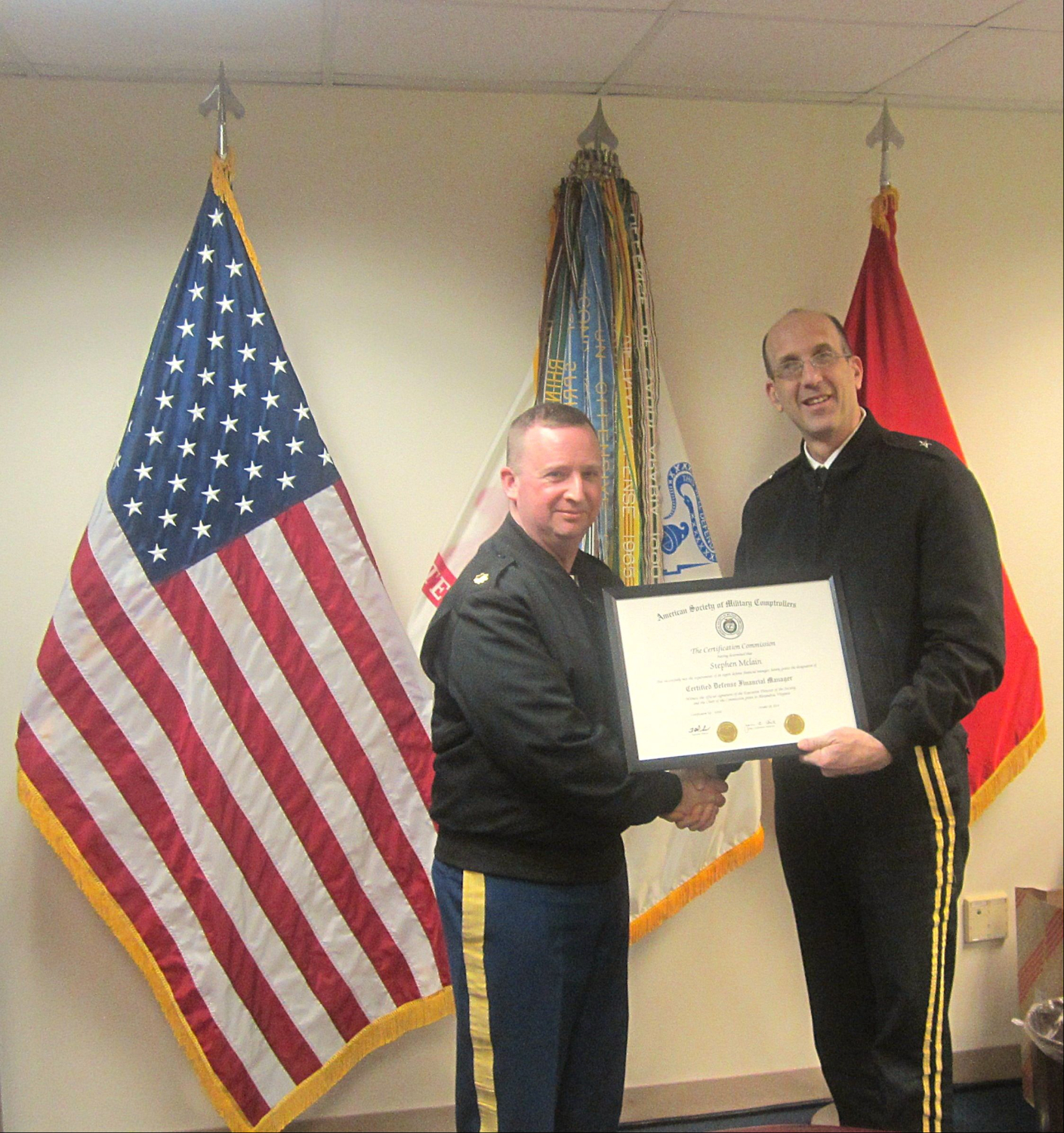 In the photo, Stephen is being presented with his certification (Certified Defense Financial Manager - CDFM) by Major General John Ferrari, Director - Army G8, Program Analysis and Evaluation.